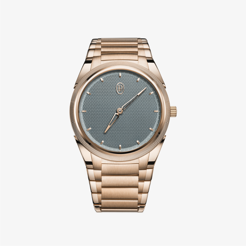 In rose gold, the Tonda PF Micro-Rotor gains tactility and depth while preserving the collection’s disciplined design language. The 40 mm case and integrated bracelet frame the Grain d’Orge guilloché dial, whose Agave Blue tone shifts subtly throughout the day.